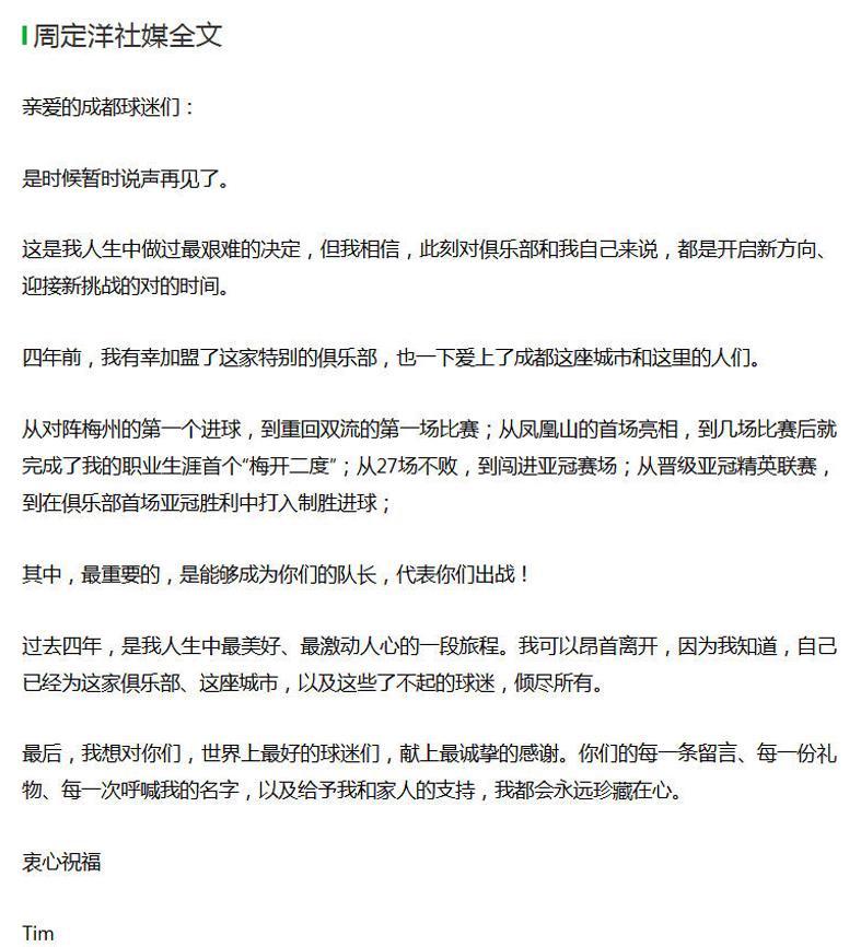 周定洋说, 这是自己人生中做过最艰难的决定,此刻对俱乐部和自己都是开启新方向、迎接新挑战的对的时间。过去四年,是他人生中最美好、最激动人心的一段旅程。他可以昂首离开,因为自己已经为这家俱乐部、这座城市,以及这些了不起的球迷,倾尽所有。最后感谢了成都球迷。